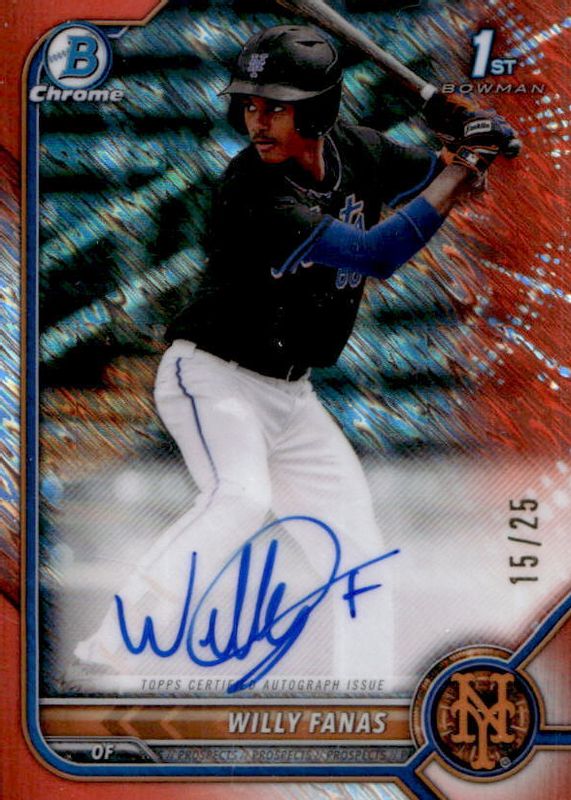This card is 1 of 22 Willy Fanas' card variations in the 2022 Bowman Chrome set being tracked by Sports Card Investor, including Prospect Auto (1st), Prospect Auto - Black & White Mini-Diamond Refractor (1st), Prospect Auto - Refractor /499 (1st), Prospect Auto - Speckle Refractor /299 (1st), and Prospect Auto - Purple Refractor /250 (1st).
