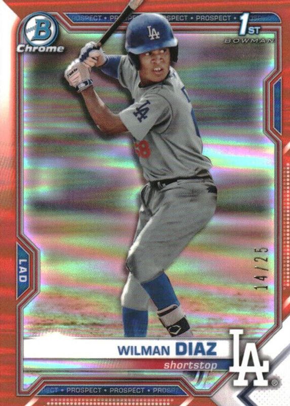 This card is 1 of 24 Wilman Diaz's card variations in the 2021 Bowman Chrome set being tracked by Sports Card Investor, including Prospects (1st), Prospects - Black & White Mini-Diamond Refractor (1st), Prospects - Shimmer Refractor (1st), Prospects - Refractor /499 (1st), and Prospects - Speckle Refractor /299 (1st).