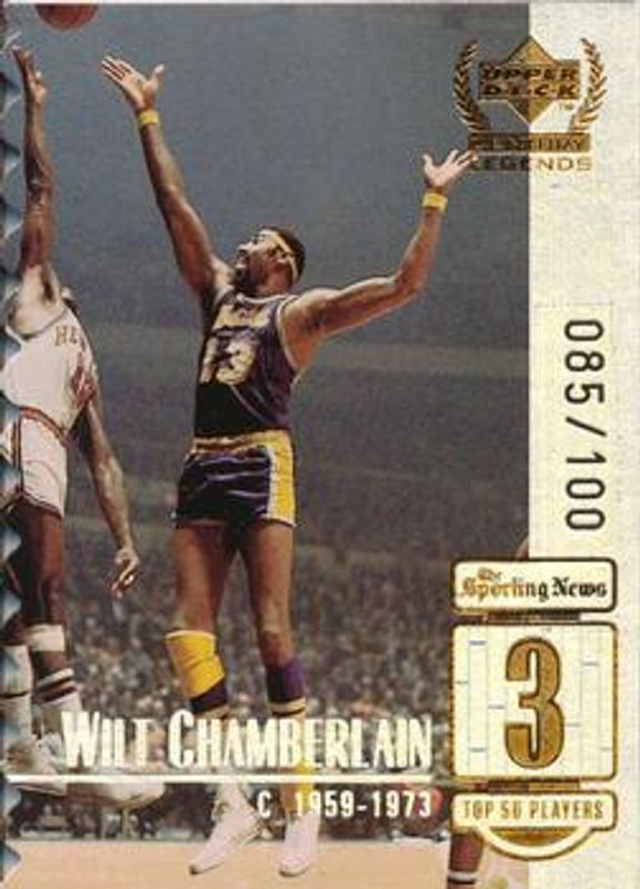 The Wilt Chamberlain 1998 Upper Deck Century Legends #3 Century Collection /100 card is 1 of 6 Wilt Chamberlain's card variations in the 1998 Upper Deck Century Legends set being tracked by Sports Card Investor, including Base, All Century Team, Epic Milestones, Epic Signatures, and Epic Signatures Century /100.