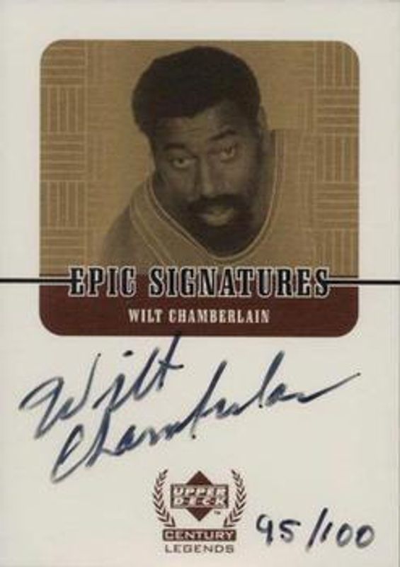 The Wilt Chamberlain 1998 Upper Deck Century Legends #WC Epic Signatures Century /100 card is 1 of 6 Wilt Chamberlain's card variations in the 1998 Upper Deck Century Legends set being tracked by Sports Card Investor, including Base, Century Collection /100, All Century Team, Epic Milestones, and Epic Signatures.
