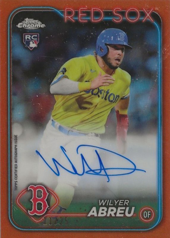 The Wilyer Abreu 2024 Topps Chrome #RA-WA Rookie Autographs - Orange Refractor /25 card in Raw condition has not changed in price in the last 30 days and was last sold for $115.00 .