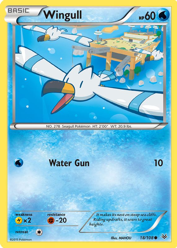 The Wingull 2015 XY: Roaring Skies #018/108 Base card in Raw TCG (Near Mint) condition has not changed in price in the last 30 days and was last sold for $0.99 .
