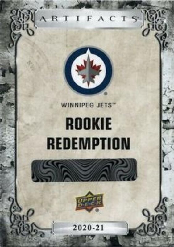 The Winnipeg Jets 2020 Upper Deck Artifacts #RED211 Rookie Redemptions card is 1 of 2 Winnipeg Jets' card variations in the 2020 Upper Deck Artifacts set being tracked by Sports Card Investor, including Rookie Redemptions - Emerald.