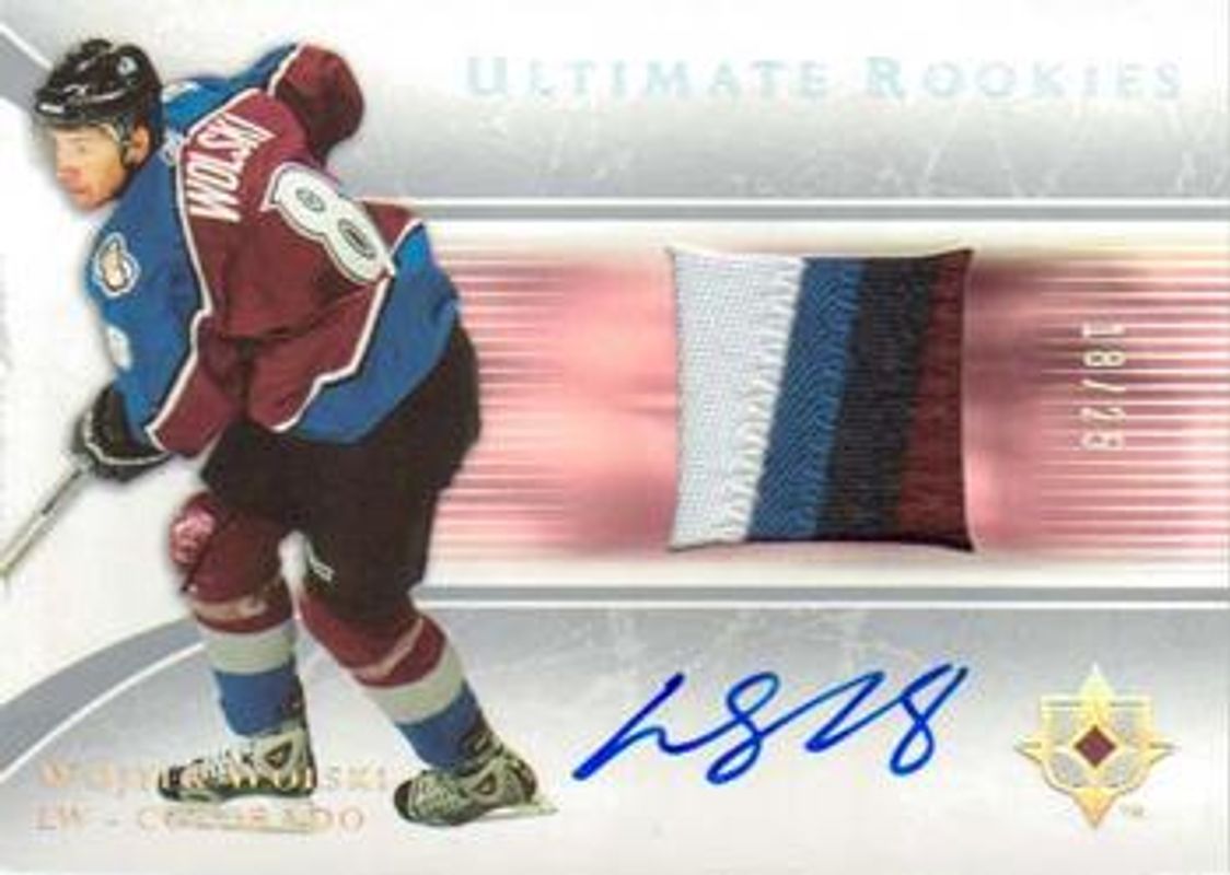 The Wojtek Wolski 2005 Upper Deck Ultimate Collection #112 Autographed Patches /25 Rookie card is 1 of 8 Wojtek Wolski's card variations in the 2005 Upper Deck Ultimate Collection set being tracked by Sports Card Investor, including Base /599, Ultimate Signatures, Ultimate Debut Threads Jerseys /250, Ultimate Debut Threads Patches /60, and Ultimate Debut Threads Jerseys Autographs /25.
