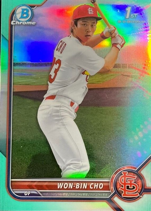 This card is 1 of 47 Won-Bin Cho's card variations in the 2022 Bowman Chrome set being tracked by Sports Card Investor, including Prospects (1st), Prospects - Black & White Mini-Diamond Refractor (1st), Prospects - Shimmer Refractor (1st), Prospects - Refractor /499 (1st), and Prospects - Speckle Refractor /299 (1st).