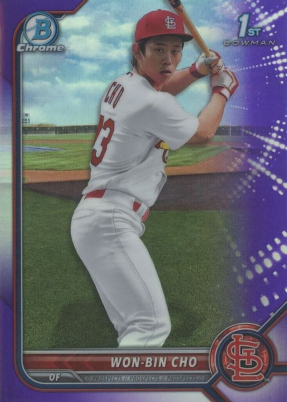 The Won-Bin Cho 2022 Bowman Chrome #BCP-154 Prospects - Purple Refractor /250 (1st) card in Raw condition has not changed in price in the last 30 days and was last sold for $3.25 .