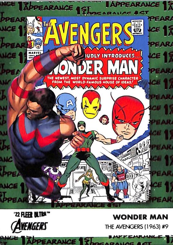 The Wonder Man 2022 Fleer Ultra Avengers #FA-1 1st Appearances Red Foil /63 card is 1 of 30 Wonder Man's card variations in the 2022 Fleer Ultra Avengers set being tracked by Sports Card Investor, including Base, Gold Rainbow Foil, Green Foil, Rainbow Foil, and Orange Foil /549.