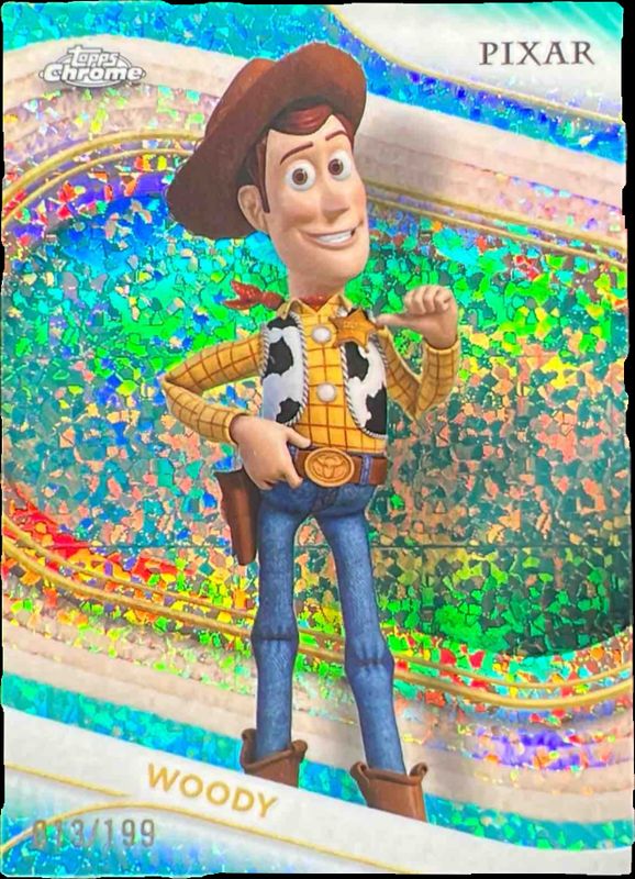 The Woody 2025 Topps Chrome Disney #89 Aqua Mini Diamonds Refractor /199 card is 1 of 37 Woody's card variations in the 2025 Topps Chrome Disney set being tracked by Sports Card Investor, including Base, Mini Diamonds Refractor, Prism Refractor, Refractor, and Yellow Mini Diamonds Refractor.