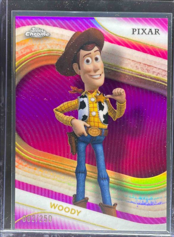 The Woody 2025 Topps Chrome Disney #89 Pink Refractor /250 card is 1 of 37 Woody's card variations in the 2025 Topps Chrome Disney set being tracked by Sports Card Investor, including Base, Mini Diamonds Refractor, Prism Refractor, Refractor, and Yellow Mini Diamonds Refractor.