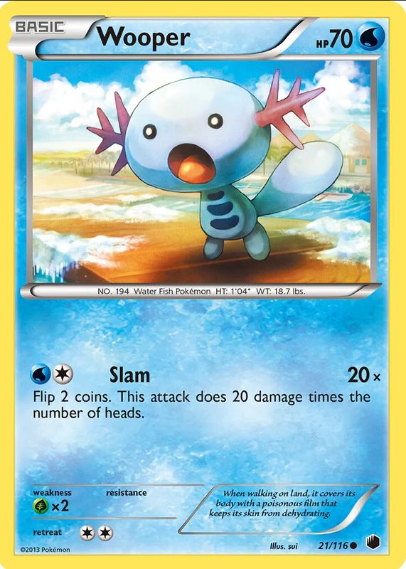 The Wooper 2013 Black & White: Plasma Freeze #021/116 Base card in Raw TCG (Near Mint) condition has moved down -$2.91 (-48.5%) in the last 30 days and was last sold for $3.09 .