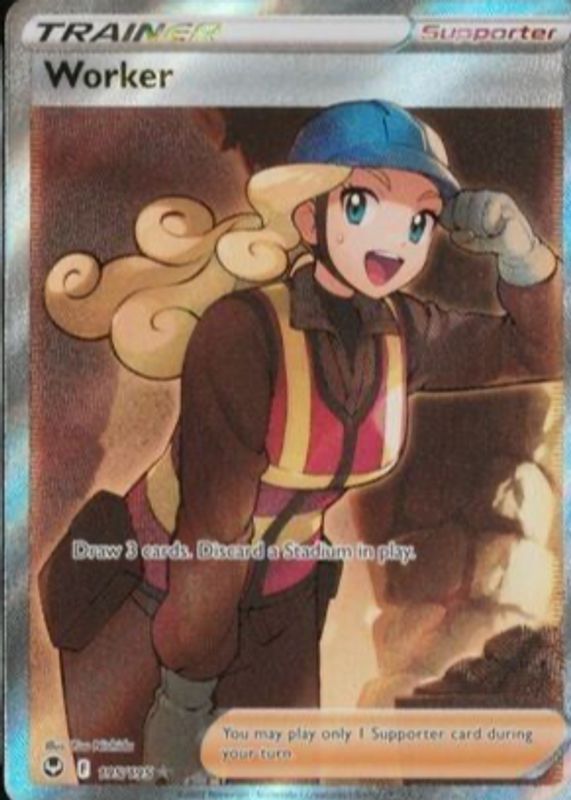 The Worker 2022 Sword & Shield: Silver Tempest #195/195 Holo (Full Art) card in Raw TCG (Near Mint) condition has moved up $3.50 (+354%) in the last 30 days and was last sold for $4.49 .