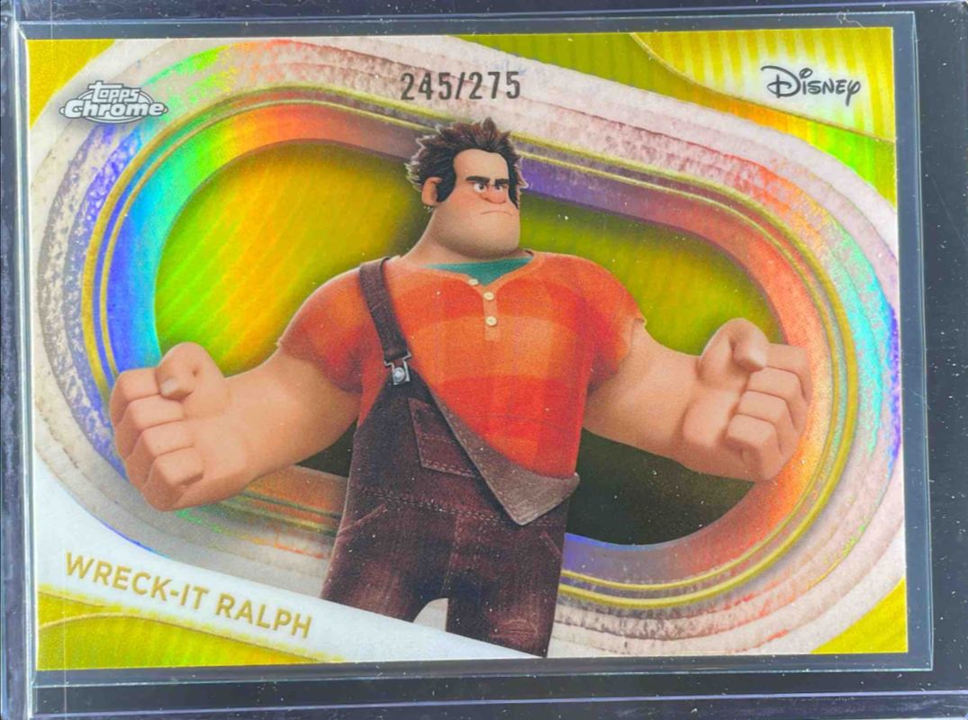 The Wreck-It Ralph 2025 Topps Chrome Disney #65 Yellow Refractor /275 card is 1 of 43 Wreck-It Ralph's card variations in the 2025 Topps Chrome Disney set being tracked by Sports Card Investor, including Base, Mini Diamonds Refractor, Prism Refractor, Refractor, and Yellow Mini Diamonds Refractor.