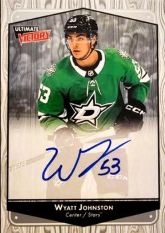 The Wyatt Johnston 2022 Upper Deck Ultimate Collection #UVA-WJ 1999 Ultimate Victory Retro Rookie Autographs card is 1 of 30 Wyatt Johnston's card variations in the 2022 Upper Deck Ultimate Collection set being tracked by Sports Card Investor, including Base /299, Ultimate Rookies Jersey /799, Ultimate Rookies Patch Auto /99, Jumbo Patch Auto /3, and Shield Patch Auto /1.