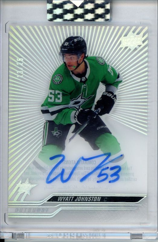 The Wyatt Johnston 2023 Upper Deck Clear Cut #CC-WJ Outburst /25 card is 1 of 7 Wyatt Johnston's card variations in the 2023 Upper Deck Clear Cut set being tracked by Sports Card Investor, including Base, High Gloss /10, Outburst Gold /1, 1998-99 Black Diamond Myriad Autographs, and 1998-99 Black Diamond Myriad Autographs - Blue /25.