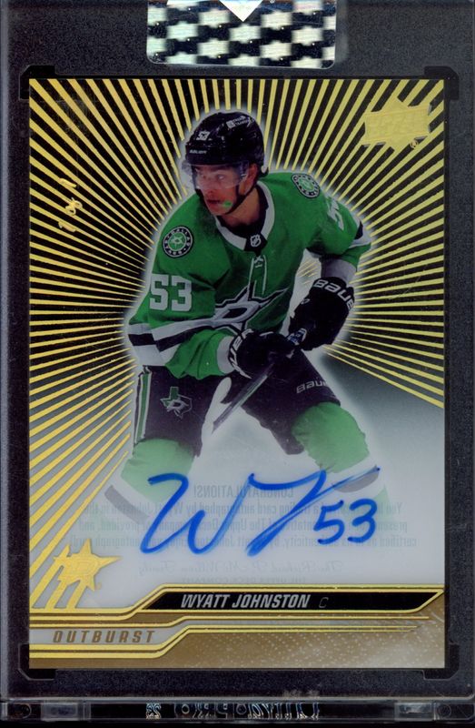 The Wyatt Johnston 2023 Upper Deck Clear Cut #CC-WJ Outburst Gold /1 card is 1 of 7 Wyatt Johnston's card variations in the 2023 Upper Deck Clear Cut set being tracked by Sports Card Investor, including Base, Outburst /25, High Gloss /10, 1998-99 Black Diamond Myriad Autographs, and 1998-99 Black Diamond Myriad Autographs - Blue /25.