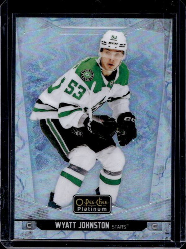 The Wyatt Johnston 2024 O-Pee-Chee Platinum #64 Arctic Freeze /99 card is 1 of 21 Wyatt Johnston's card variations in the 2024 O-Pee-Chee Platinum set being tracked by Sports Card Investor, including Base, Neon Yellow Surge, Pink Magma, Rainbow, and Sunset.
