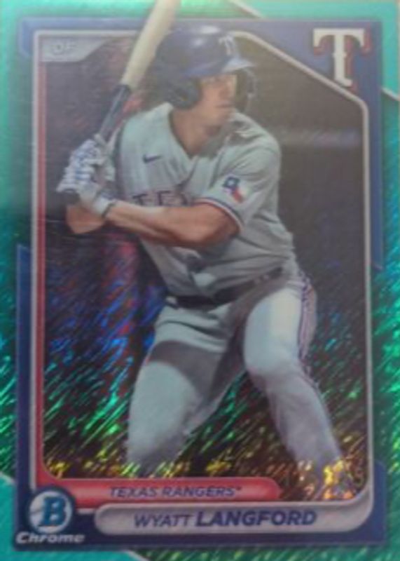 Best Prices Available For Sale of Wyatt Langford 2024 Bowman #BCP-64 Chrome Prospects - Aqua Shimmer Refractor /125