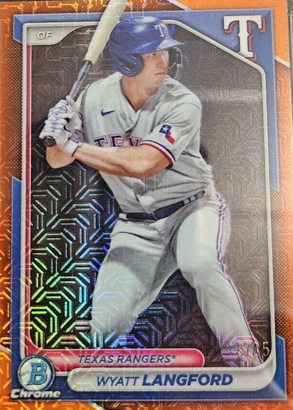 Best Prices Available For Sale of Wyatt Langford 2024 Bowman #BCP-64 Chrome Prospects - Orange Refractor /25