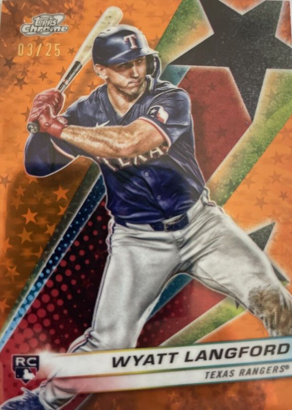 The Wyatt Langford 2024 Topps Chrome Cosmic #SF-97 Starfractor - Orange Galactic Refractor /25 Rookie card in Raw condition has not changed in price in the last 30 days and was last sold for $77.76 .