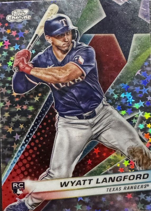The Wyatt Langford 2024 Topps Chrome Cosmic #SF-97 Starfractor Rookie card in Raw condition has moved down -$17.00 (-35.4%) in the last 30 days and was last sold for $31.00 .