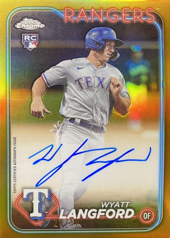 The Wyatt Langford 2024 Topps Chrome #RA-WL Rookie Autographs - Gold Refractor /50 card in Raw condition has not changed in price in the last 30 days and was last sold for $800.00 .