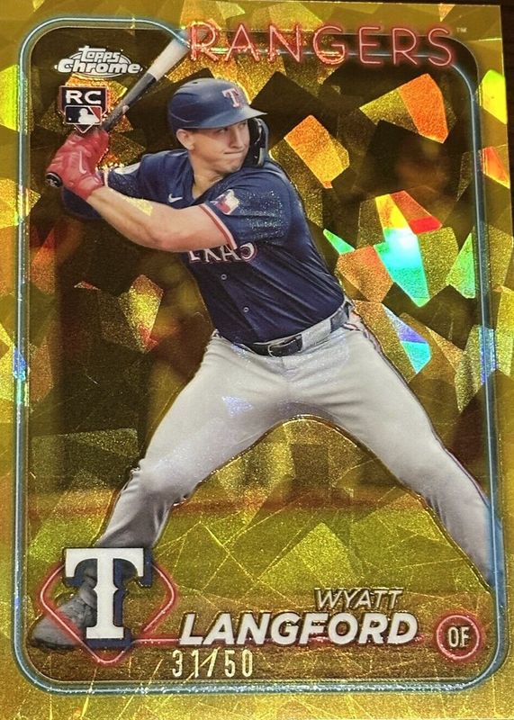 The Wyatt Langford 2024 Topps Chrome Update Sapphire Edition #USCS151 Gold /50 Rookie card in Raw condition has not changed in price in the last 30 days and was last sold for $130.00 .