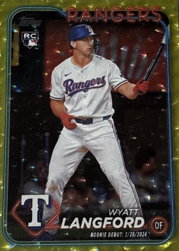 The Wyatt Langford 2024 Topps Update #US341 Rookie Debut - Yellow Crackle Foilboard /50 card in Raw condition has not changed in price in the last 30 days and was last sold for $100.00 .