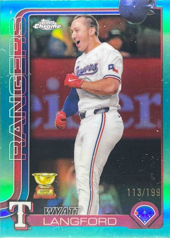 The Wyatt Langford 2025 Topps Chrome #68 Aqua Refractor /199 card in Raw condition has moved up $2.25 (+64.3%) in the last 30 days and was last sold for $5.75 .
