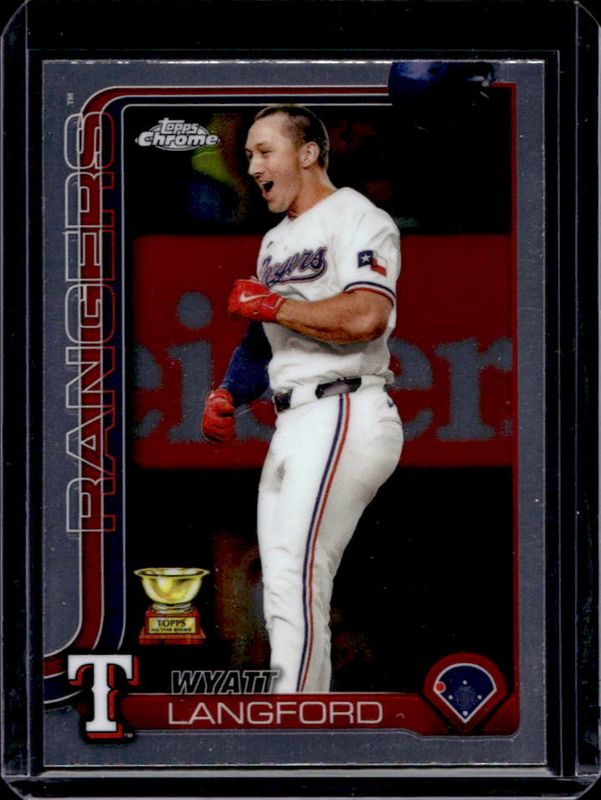 The Wyatt Langford 2025 Topps Chrome #68 Base card is 1 of 67 Wyatt Langford's card variations in the 2025 Topps Chrome set being tracked by Sports Card Investor, including Geometric Refractor, Lightboard Logo Variation, Negative Refractor, Prism Refractor, and RayWave Refractor.