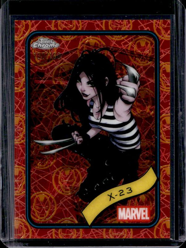 The X-23 2025 Topps Chrome #122 Iron Man Red & Gold Lazer Refractor /100 card is 1 of 23 X-23's card variations in the 2025 Topps Chrome set being tracked by Sports Card Investor, including Base, Refractor, Yellow Lava Refractor, Spider Web Refractor /399, and Blue Refractor /299.