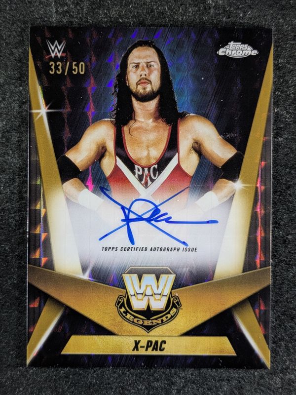 The X-Pac 2025 Topps Chrome WWE #LCA-XP Legendary Chrome Autographs - Gold Geometric Refractor /50 card is 1 of 17 X-Pac's card variations in the 2025 Topps Chrome WWE set being tracked by Sports Card Investor, including Embedded, Legendary Chrome Autographs, Legendary Chrome Autographs - Geometric Refractor, Legendary Chrome Autographs - Refractor /175, and Embedded - Gold Refractor /50.