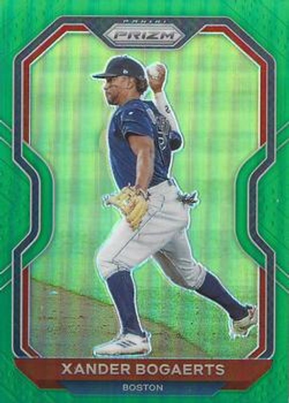 The Xander Bogaerts 2021 Prizm #215 Green card is 1 of 48 Xander Bogaerts' card variations in the 2021 Prizm set being tracked by Sports Card Investor, including Base, Blue, Blue Velocity, Carolina Blue, and Cosmic Haze.