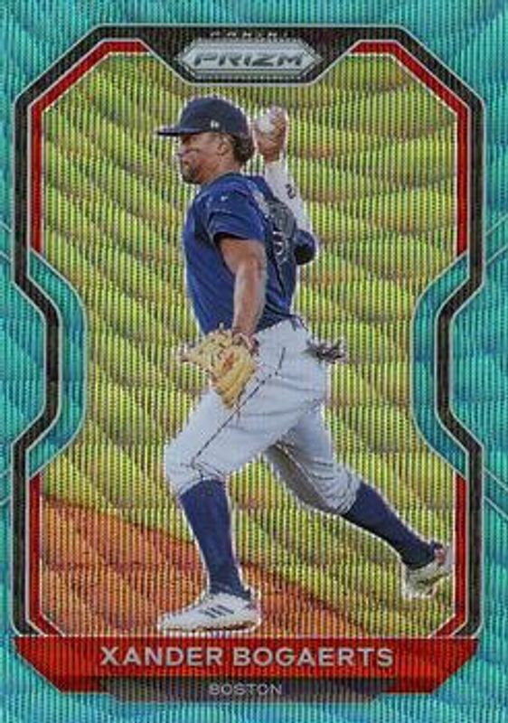 The Xander Bogaerts 2021 Prizm #215 Teal Wave card is 1 of 48 Xander Bogaerts' card variations in the 2021 Prizm set being tracked by Sports Card Investor, including Base, Blue, Blue Velocity, Carolina Blue, and Cosmic Haze.