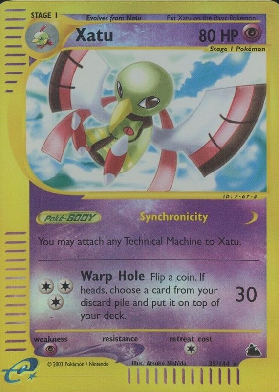 The Xatu 2003 Skyridge #035/144 Reverse Holo card in Raw TCG (Near Mint) condition has not changed in price in the last 30 days and was last sold for $49.49 .
