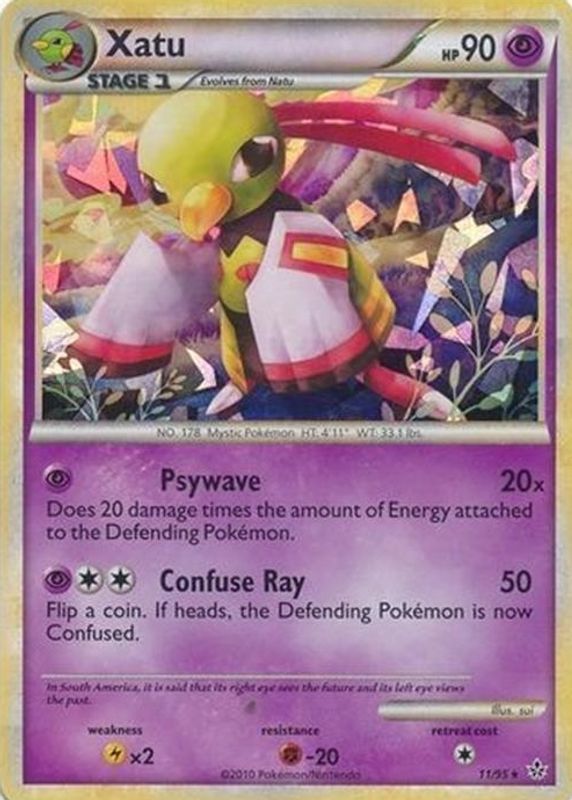 The Xatu 2010 HeartGold & SoulSilver: Unleashed #11/95 Promo (Cracked Ice) card in Raw TCG (Lightly Played) condition has not changed in price in the last 30 days and was last sold for $9.99 .