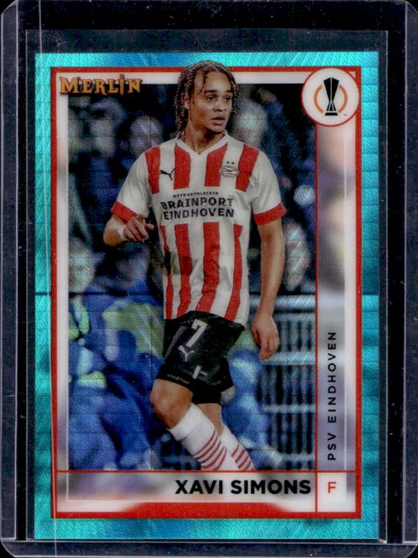 The Xavi Simons 2022 Topps Merlin Chrome UEFA Club Competitions #107 Aqua Prism Refractor card is 1 of 24 Xavi Simons' card variations in the 2022 Topps Merlin Chrome UEFA Club Competitions set being tracked by Sports Card Investor, including Base, Refractor, Vintage Merlin Refractor, Atomic Refractor /250, and Aqua Refractor /199.