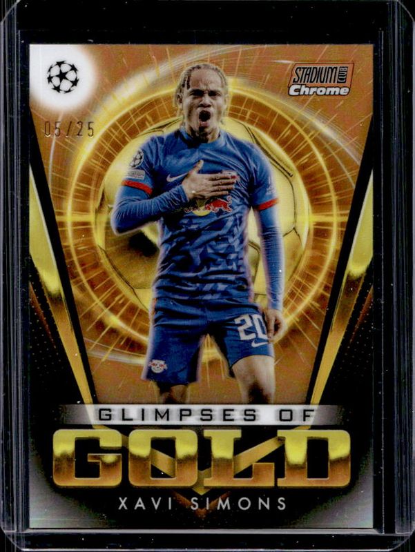 The Xavi Simons 2023 Topps Stadium Club Chrome UEFA Champions League #GG-XS Glimpses of Gold - Orange Refractor /25 card is 1 of 32 Xavi Simons' card variations in the 2023 Topps Stadium Club Chrome UEFA Champions League set being tracked by Sports Card Investor, including Base, Members Only Refractor, Pink Red Electric Charge Refractor, Refractor, and Black & White Refractor /299.