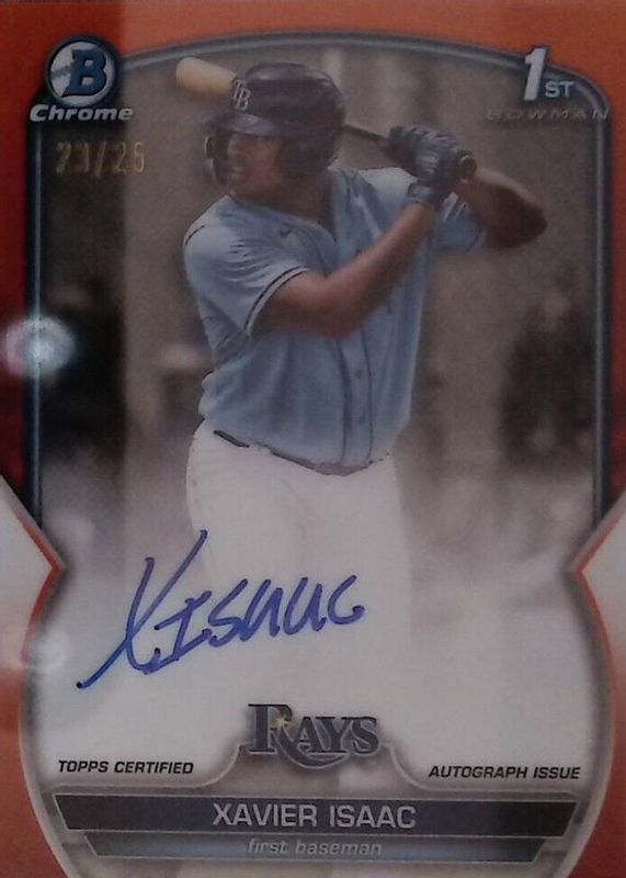 The Xavier Isaac 2023 Bowman #CPA-XI Chrome Prospect Auto - Orange Refractor /25 (1st) card in Raw condition has not changed in price in the last 30 days and was last sold for $1,010.00 .