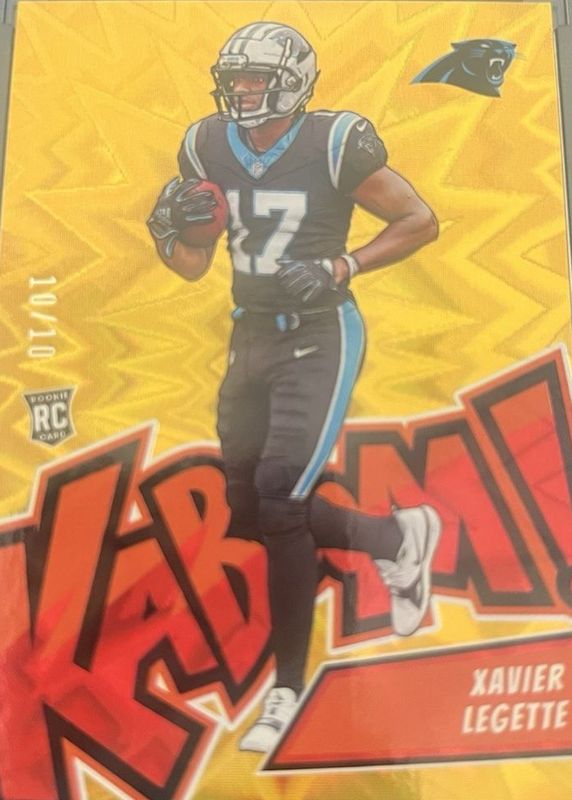 The Xavier Legette 2024 Absolute #16 Kaboom! (Vertical) - Gold /10 Rookie card in Raw condition has not changed in price in the last 30 days and was last sold for $3,000.00 .