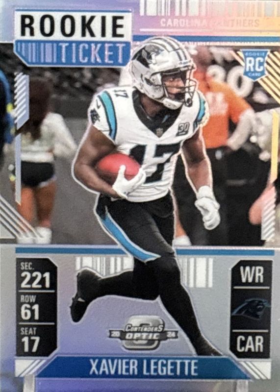 This card is 1 of 53 Xavier Legette's card variations in the 2024 Contenders Optic set being tracked by Sports Card Investor, including Base, Red /199, Blue /99, Orange /75, and Green Pulsar /49.