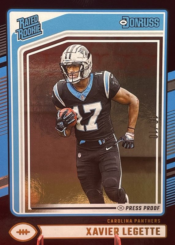 The Xavier Legette 2024 Donruss #323 Press Proof Black /10 Rookie card in Raw condition has not changed in price in the last 30 days and was last sold for $65.00 .