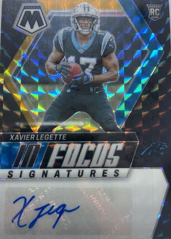 The Xavier Legette 2024 Mosaic #IF-XLE In Focus Signatures - Choice Black Gold /8 Rookie card in Raw condition has not changed in price in the last 30 days and was last sold for $174.43 .