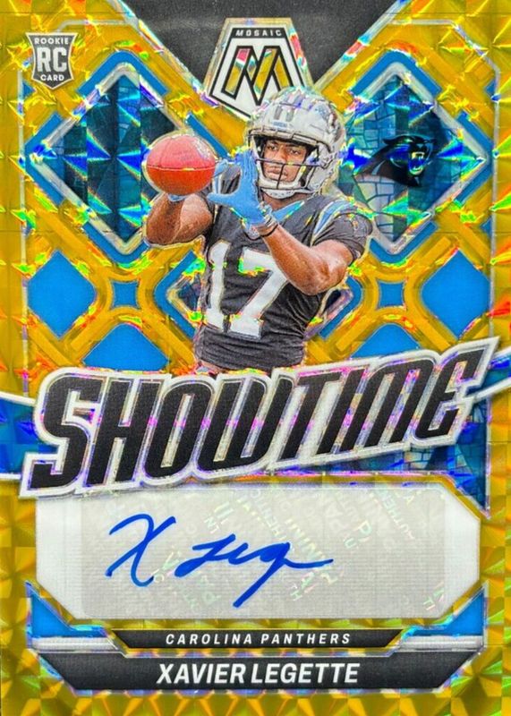 The Xavier Legette 2024 Mosaic #SS-XLE Showtime Signatures - Gold /10 Rookie card in Raw condition has not changed in price in the last 30 days and was last sold for $197.50 .