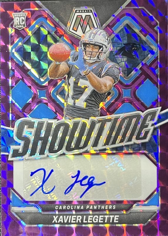 The Xavier Legette 2024 Mosaic #SS-XLE Showtime Signatures - Purple /49 Rookie card in Raw condition has not changed in price in the last 30 days and was last sold for $19.99 .
