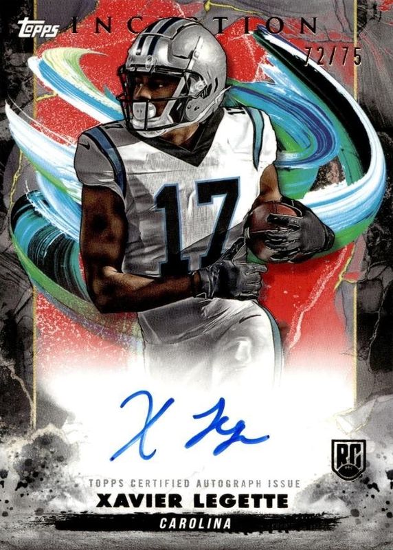 This card is 1 of 26 Xavier Legette's card variations in the 2024 Topps Inception set being tracked by Sports Card Investor, including Rookie Autographs, Rookie Autographs Variation, Provenance Patch Autographs - Green /150, Rookie Autographs - Green /150, and Rookie Autographs Variation - Green /150.