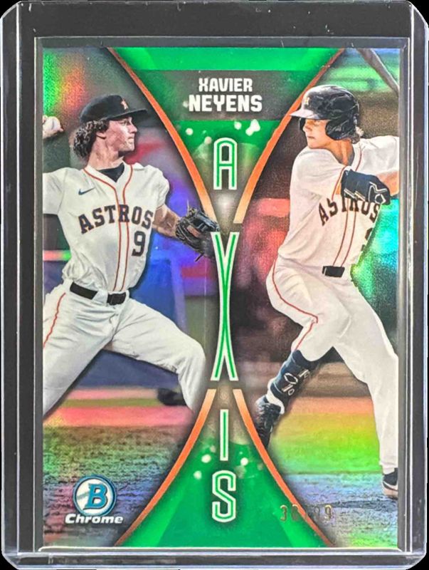 The Xavier Neyens 2025 Bowman Draft #A-10 Axis - Green Refractor /99 card is 1 of 124 Xavier Neyens' card variations in the 2025 Bowman Draft set being tracked by Sports Card Investor, including Base (1st), Chrome (1st), Chrome - Lazer Refractor (1st), Chrome - Refractor (1st), and Chrome - Sky Blue Refractor (1st).