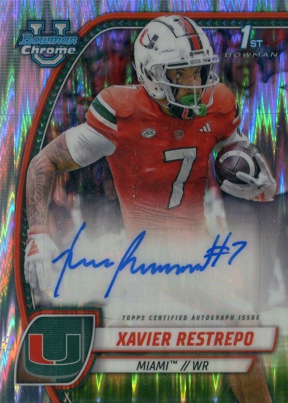 This card is 1 of 14 Xavier Restrepo's card variations in the 2024 Bowman Chrome University set being tracked by Sports Card Investor, including Prospect Auto (1st), Prospect Auto - Refractor /299 (1st), Prospect Auto - Fuchsia Refractor /150 (1st), Prospect Auto - Green Refractor /99 (1st), and Prospect Auto - Yellow Refractor /75 (1st).