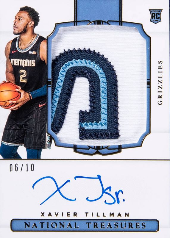 This card is 1 of 9 Xavier Tillman's card variations in the 2020 National Treasures set being tracked by Sports Card Investor, including Rookie Patch Auto /99, Rookie Patch Auto - Gold FOTL /24, Rookie Patch Auto - Purple FOTL /8, Rookie Patch Auto - Emerald /5, and Rookie Patch Auto - Blue FOTL /3.