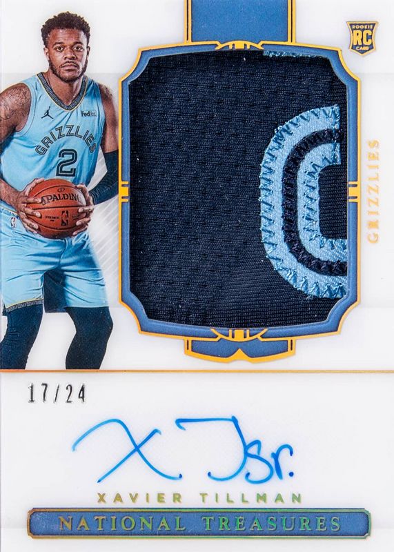 This card is 1 of 9 Xavier Tillman's card variations in the 2020 National Treasures set being tracked by Sports Card Investor, including Rookie Patch Auto /99, Rookie Patch Auto - Gold /10, Rookie Patch Auto - Purple FOTL /8, Rookie Patch Auto - Emerald /5, and Rookie Patch Auto - Blue FOTL /3.