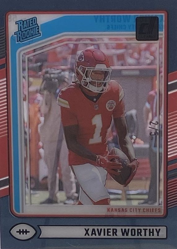This card is 1 of 26 Xavier Worthy's card variations in the 2024 Clearly Donruss set being tracked by Sports Card Investor, including Base, Pink, Rated Rookie Logos, Teal, and Orange /199.